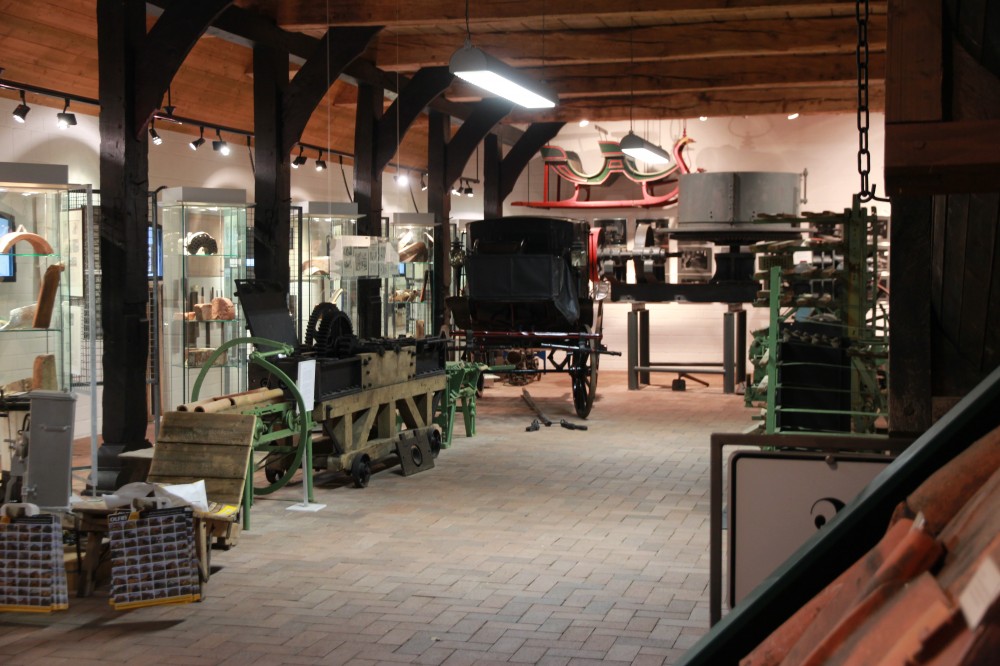 Eine Kutsche (Landauer) und ein Pferdeschlitten aus dem 19. Jahrhundert zeigen die damaligen Möglichkeiten der Fortbewegung.
